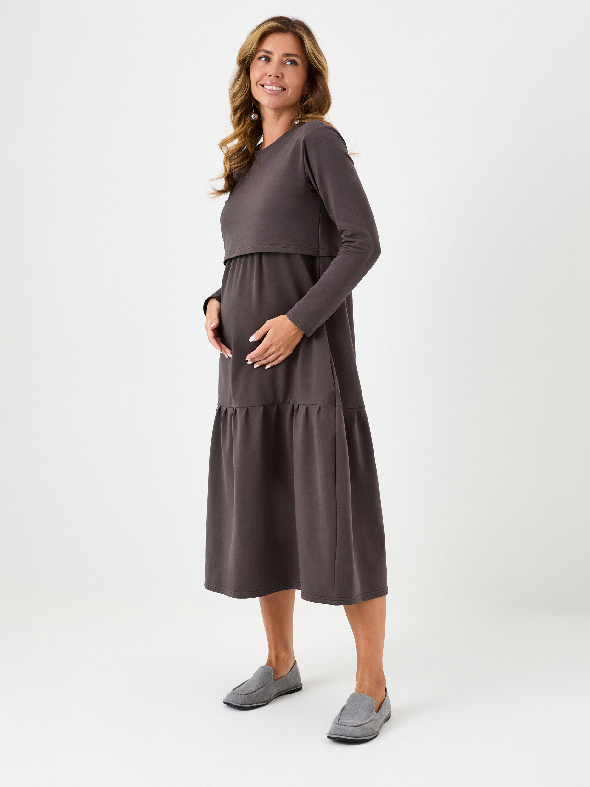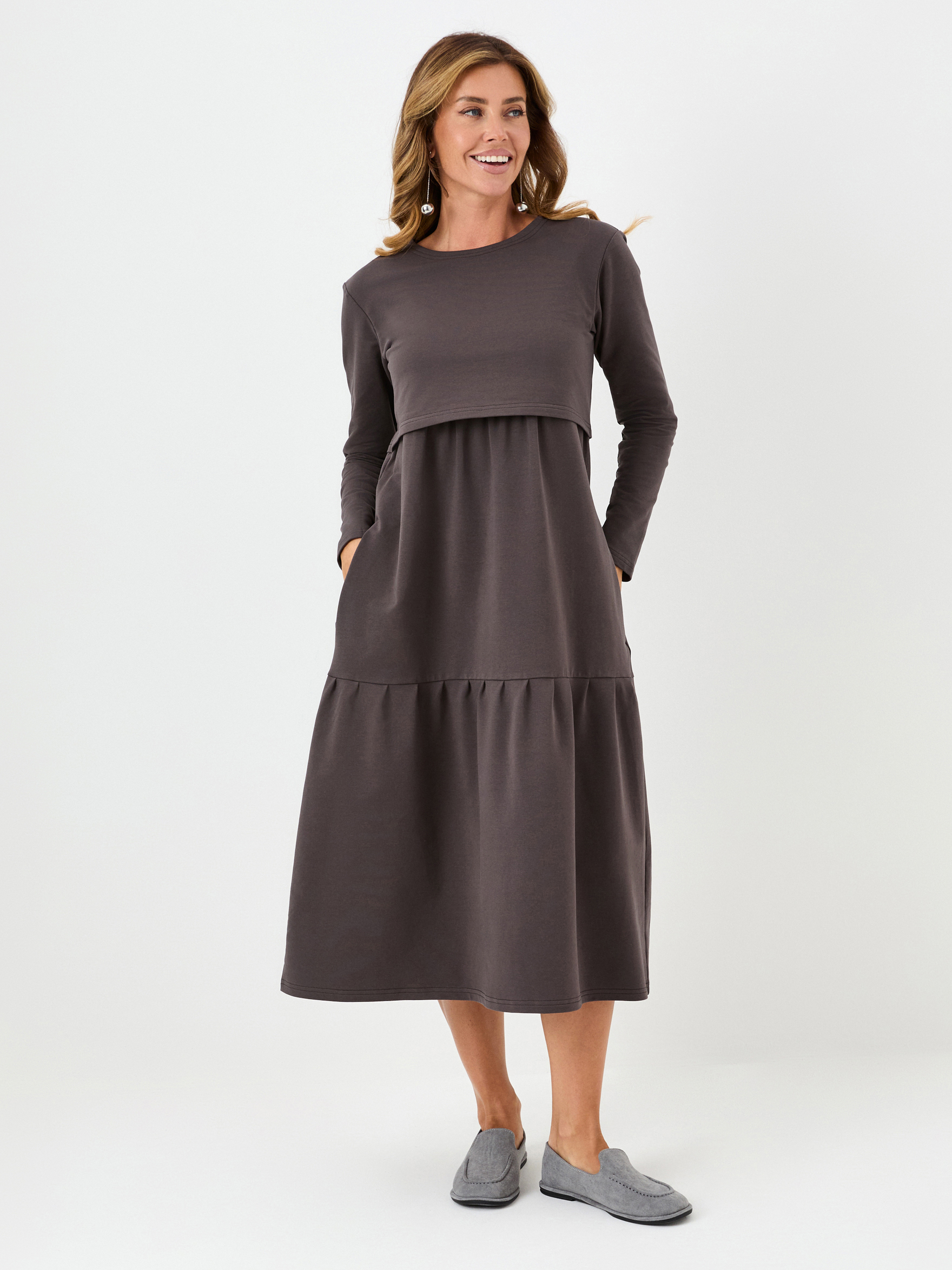 Уютное платье оригинального и самого актуального сейчас свободного ярусного кроя и модного шоколадного оттенка сшито из мягкого и теплого футера, приятного к телу. Кармашки - еще одна важная деталь этой модели.