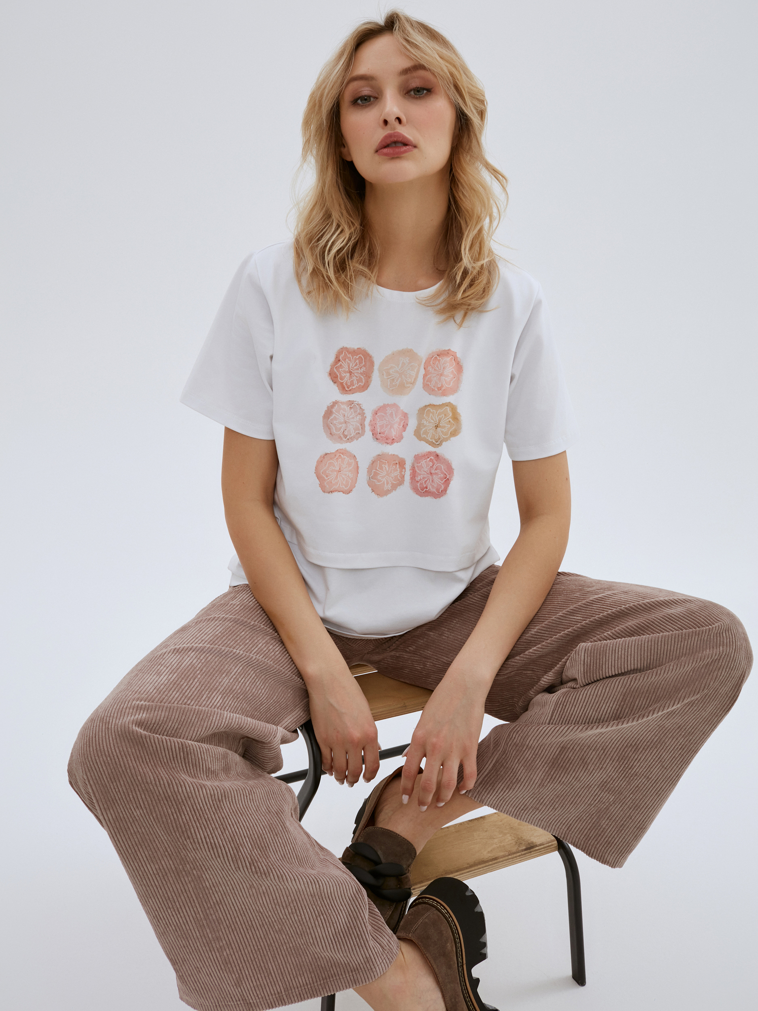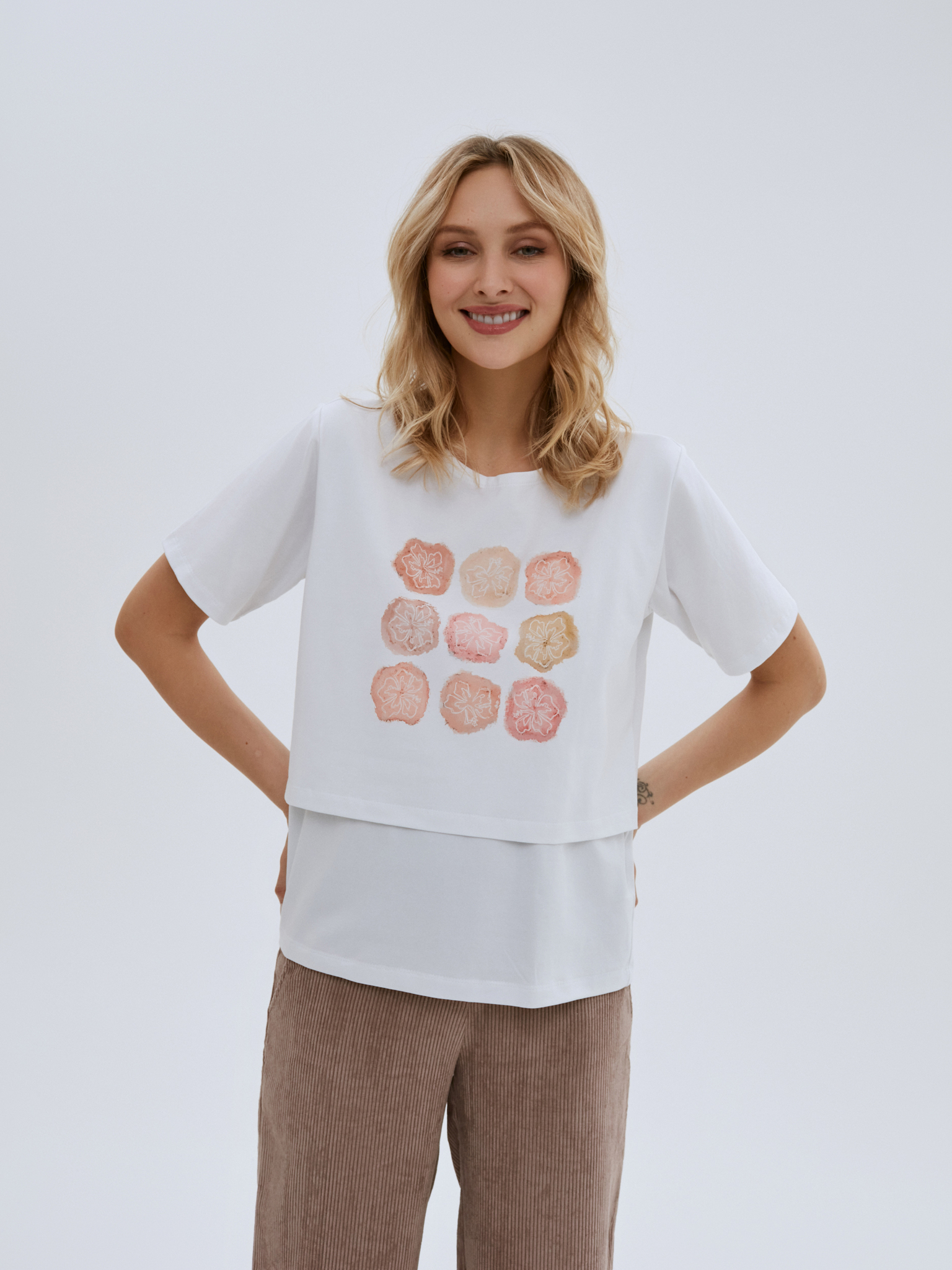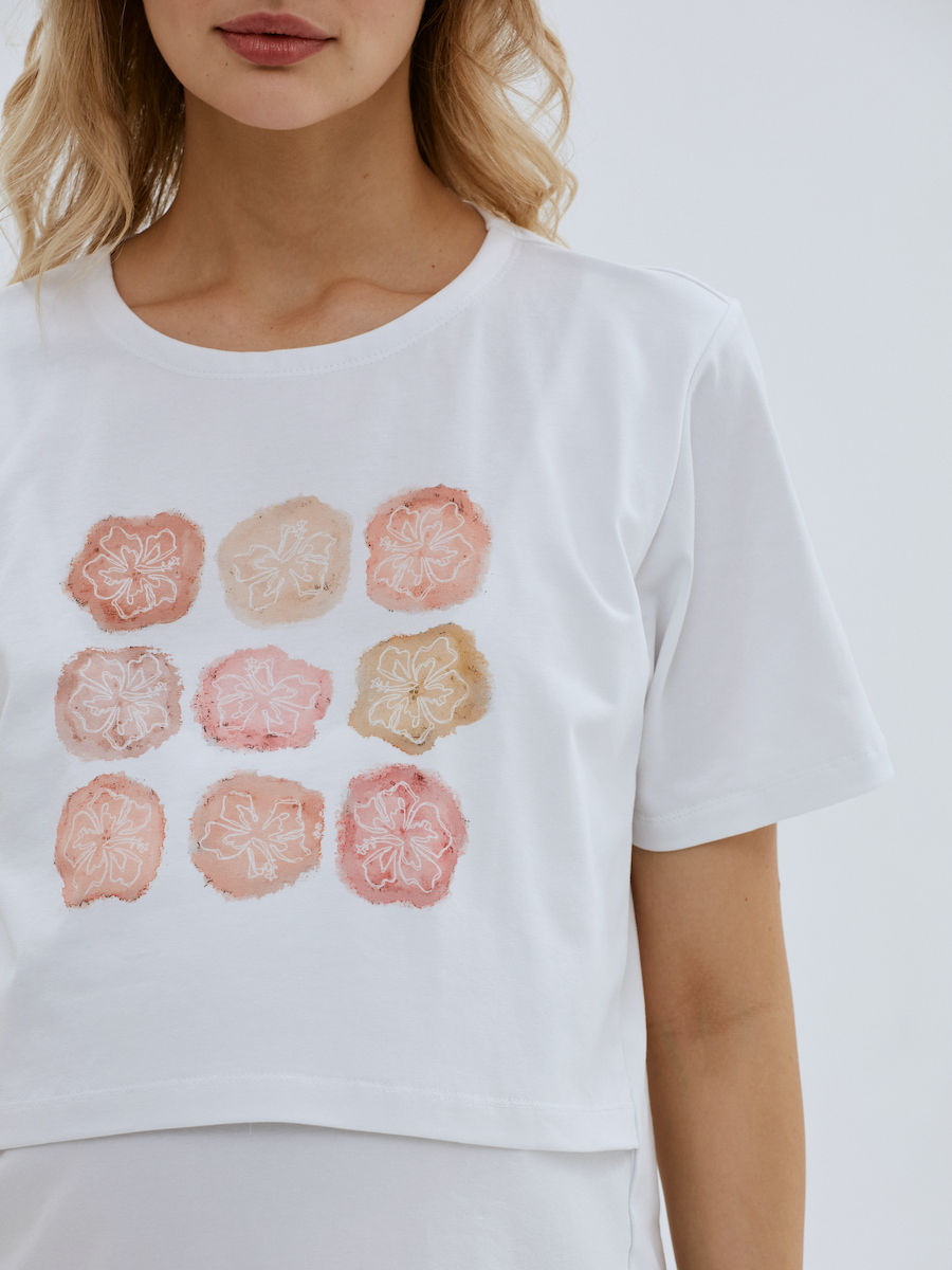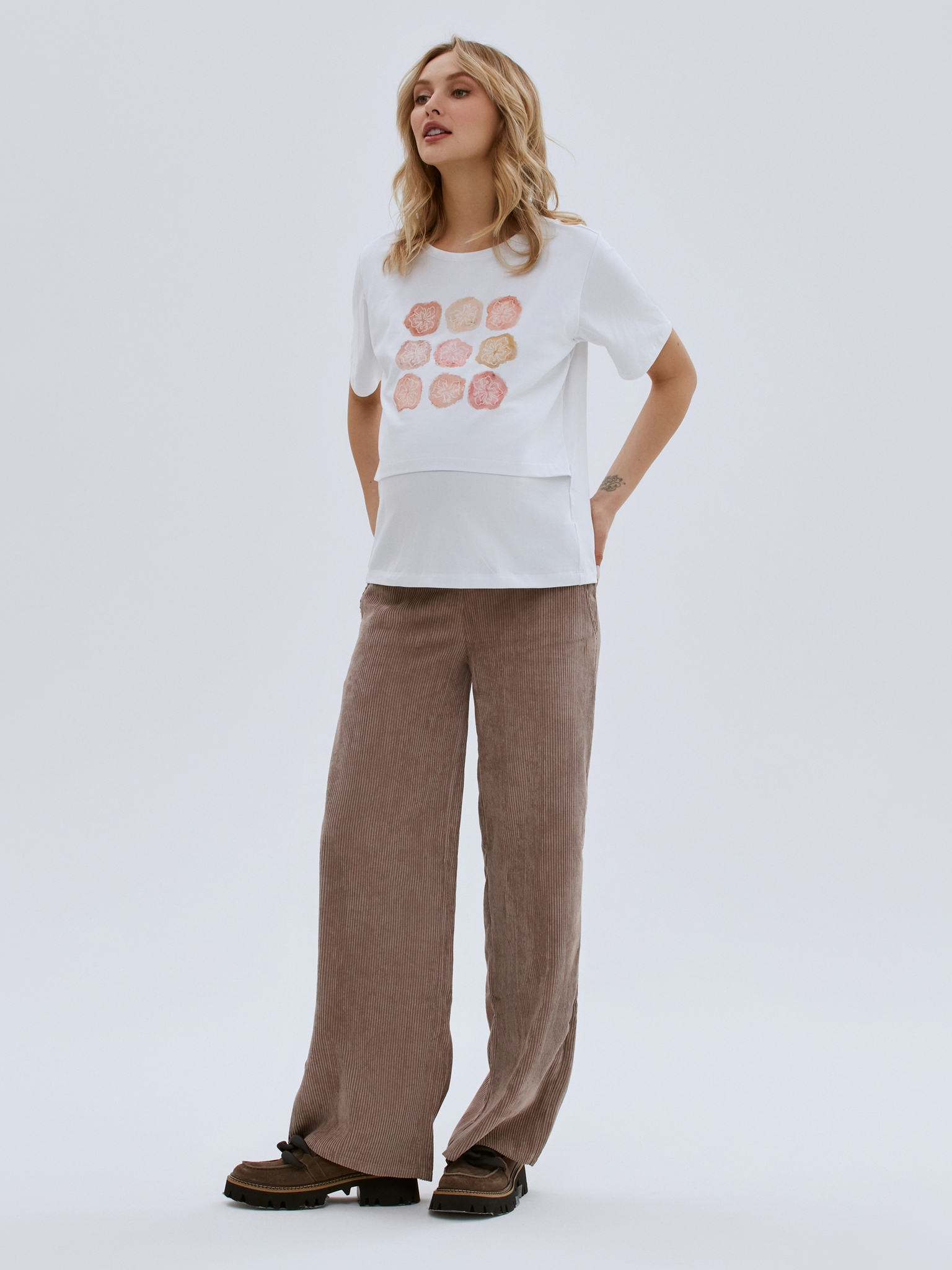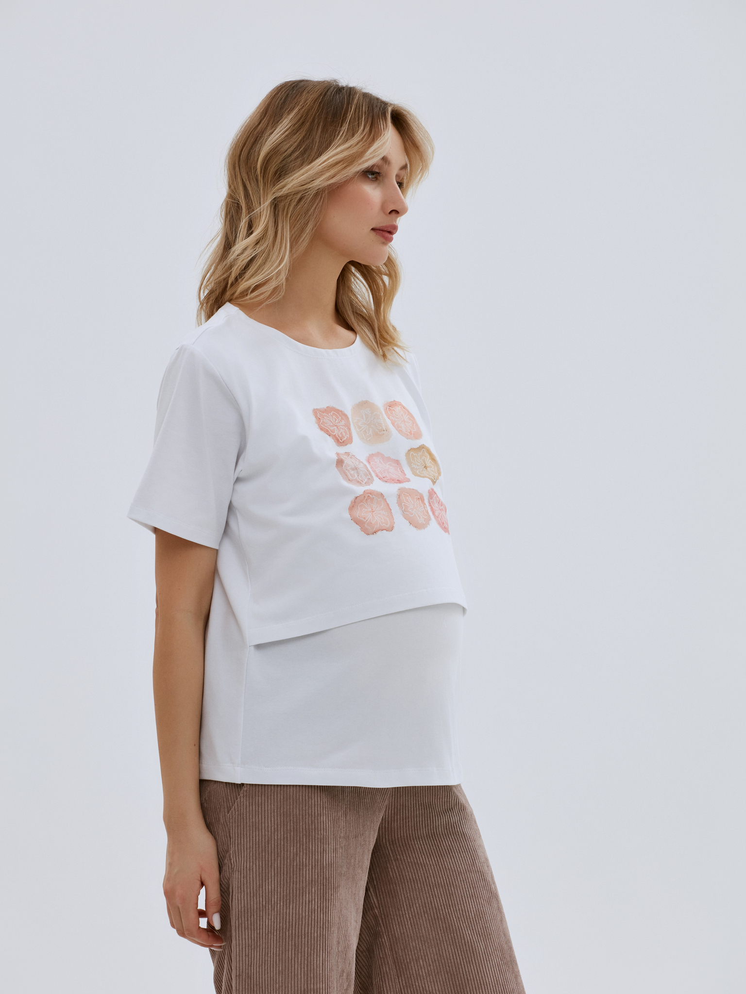 Повседневная футболка свободного кроя с ярким принтом. Подходит и будущим, и кормящим мамам: секрет для доступа груди спрятан под коротким слоем.