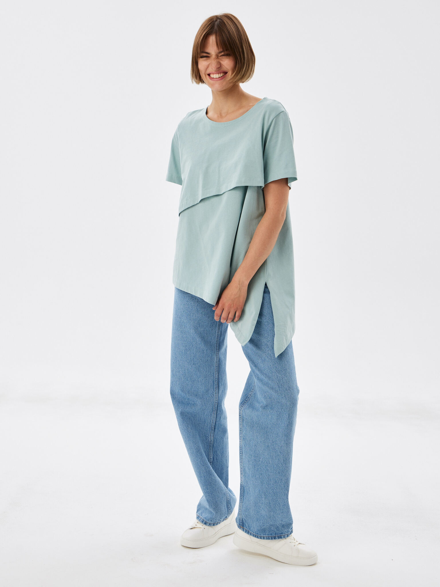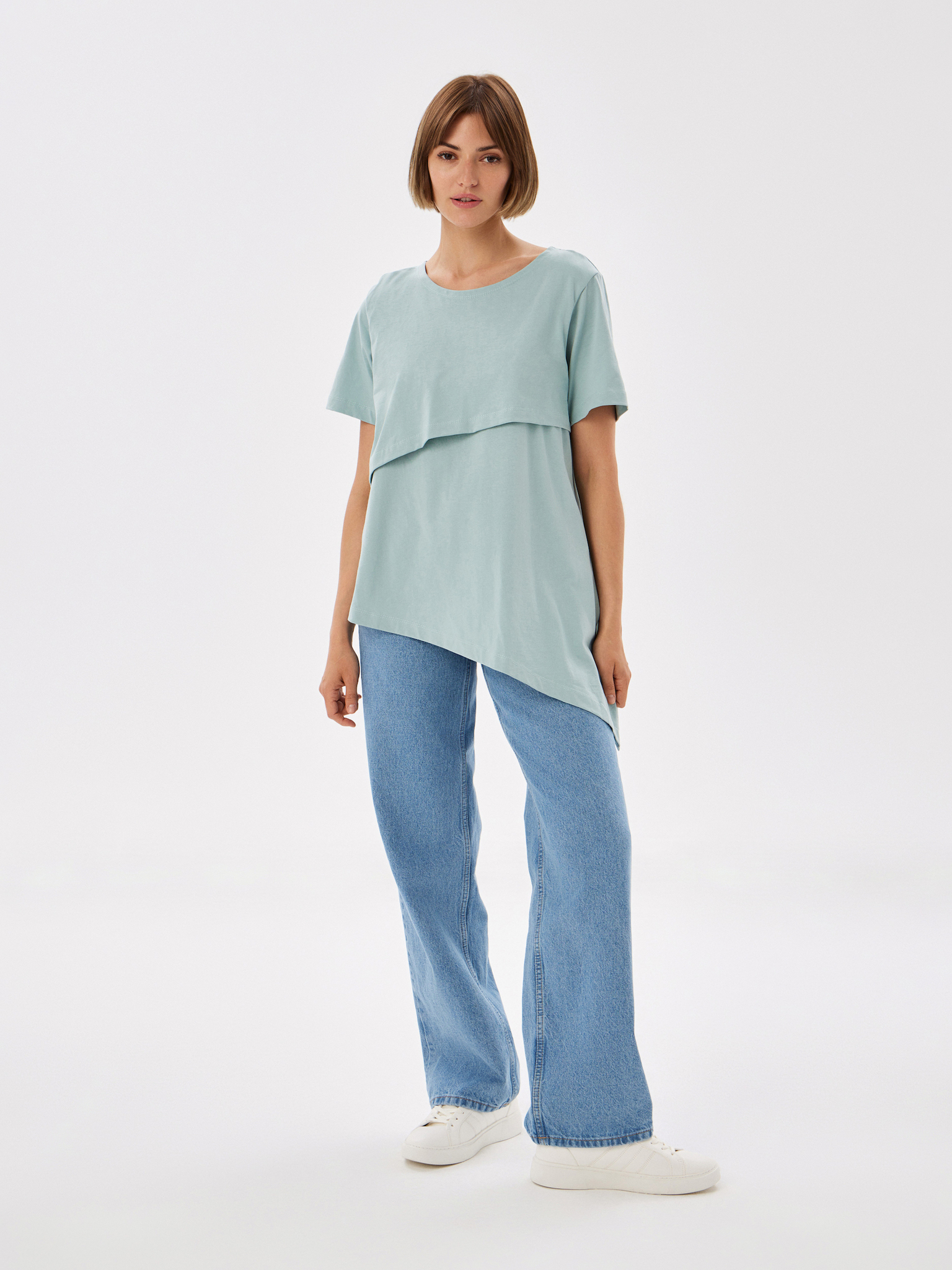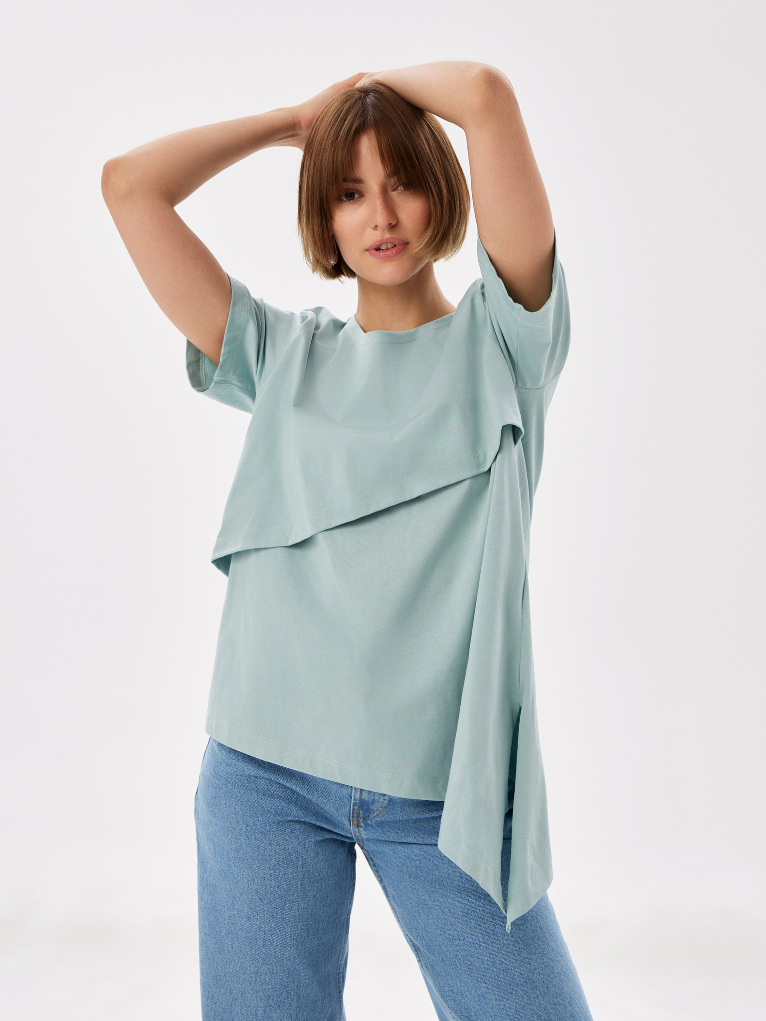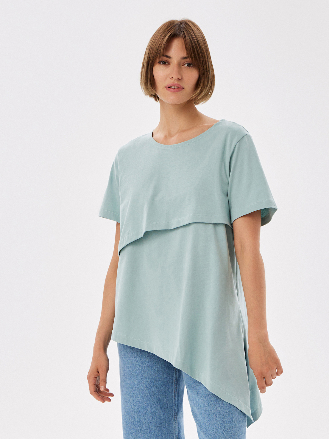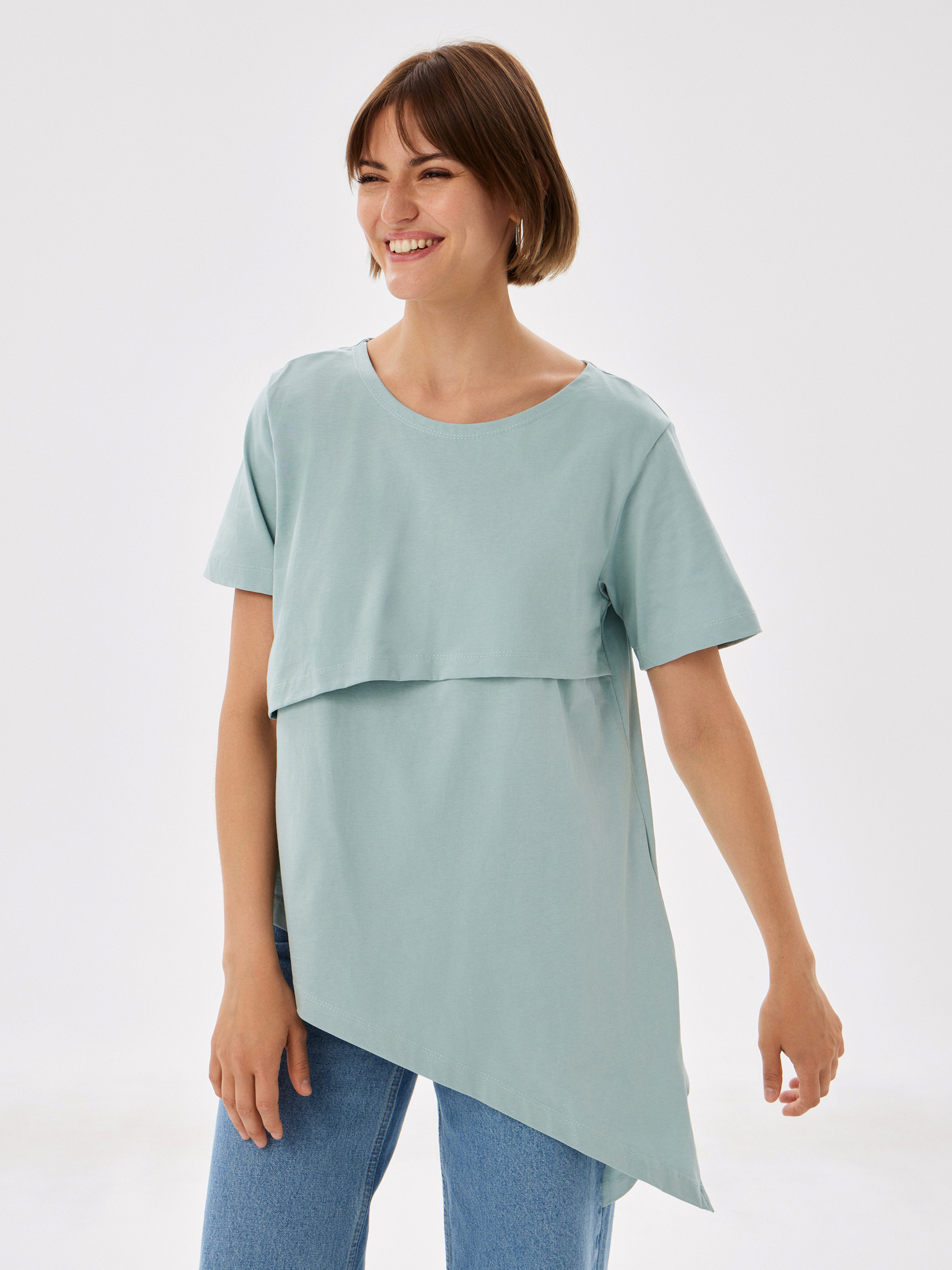 Под верхней отлетной частью спрятан глубокий вырез, превращающий футболку в удобную для кормления малыша вещь.