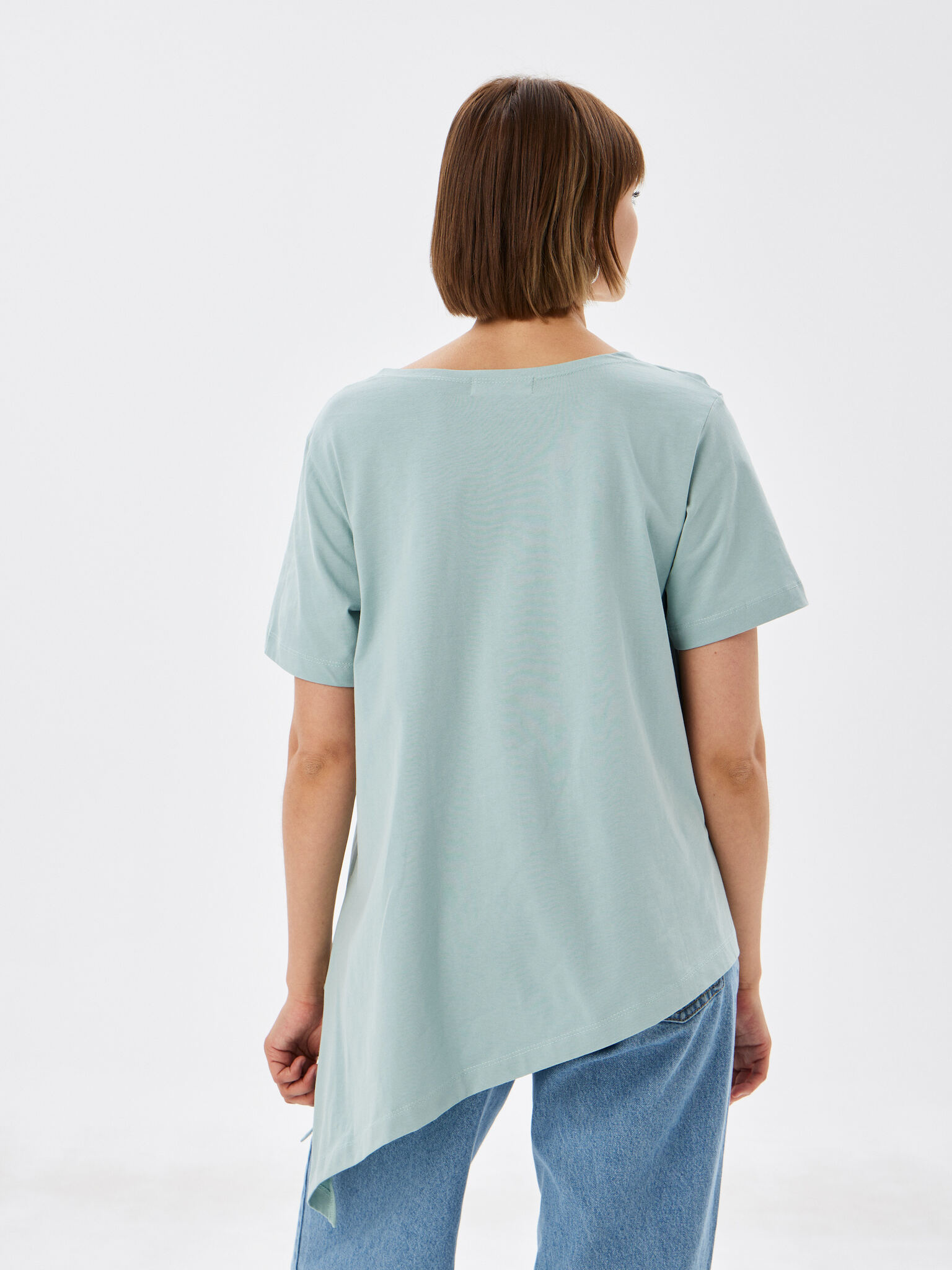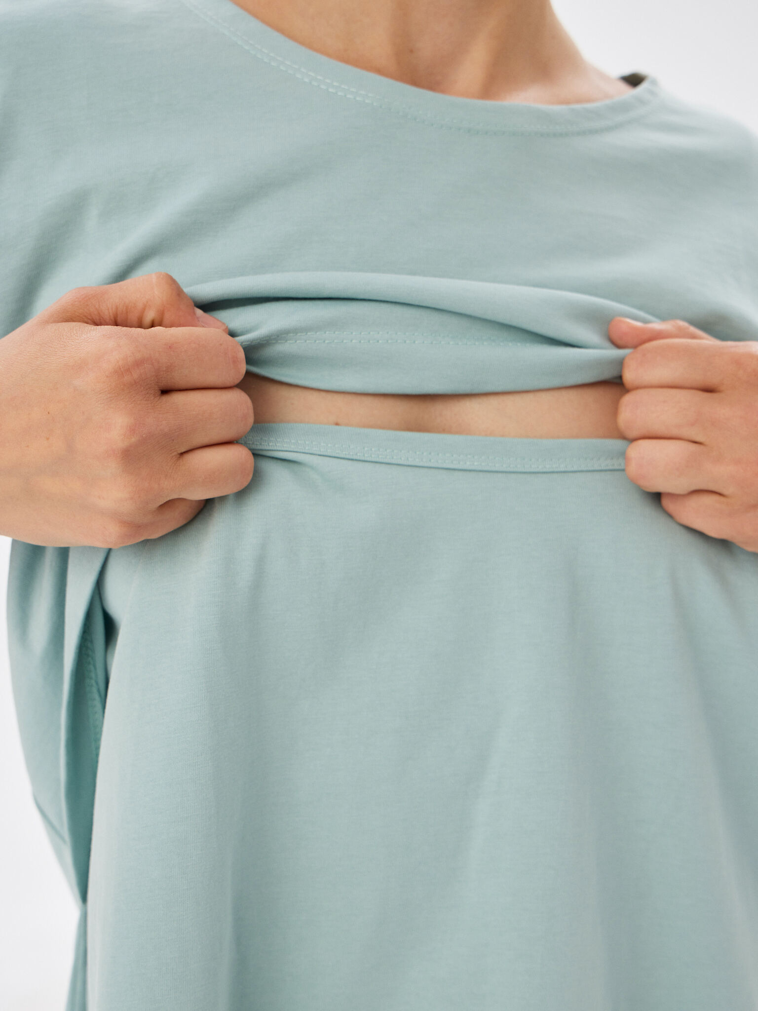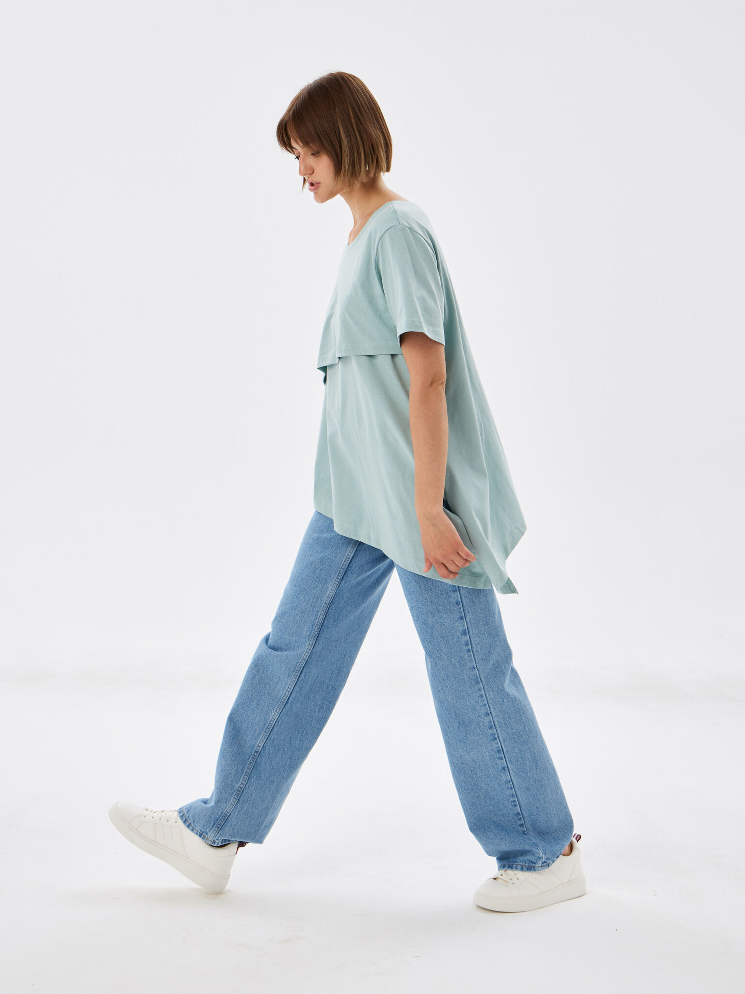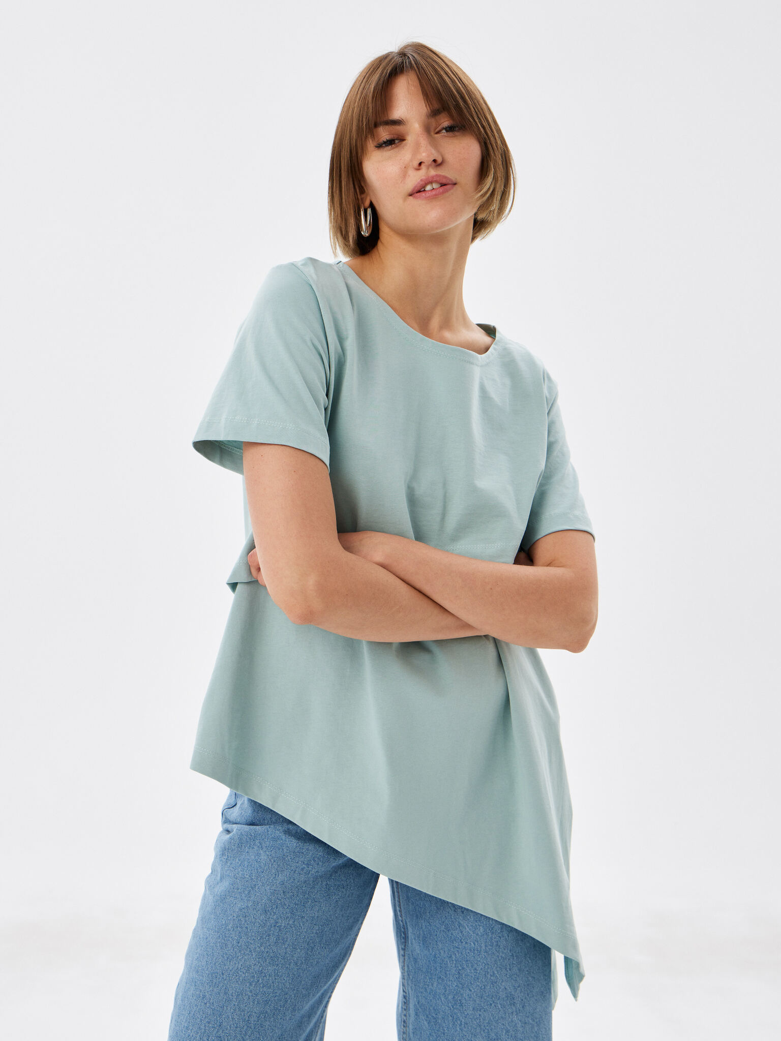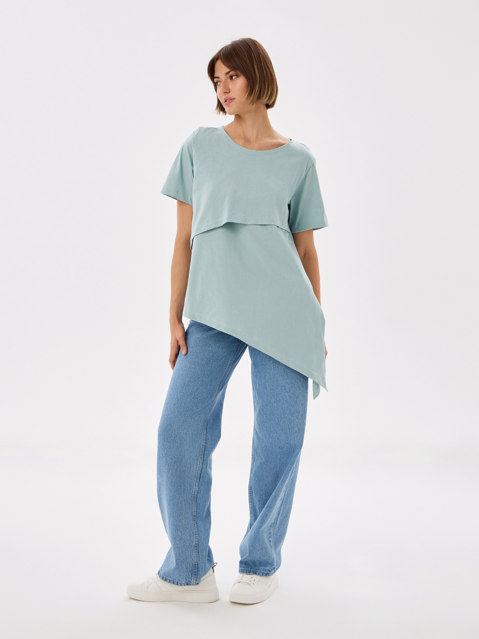 Под верхней отлетной частью спрятан глубокий вырез, превращающий футболку в удобную для кормления малыша вещь.