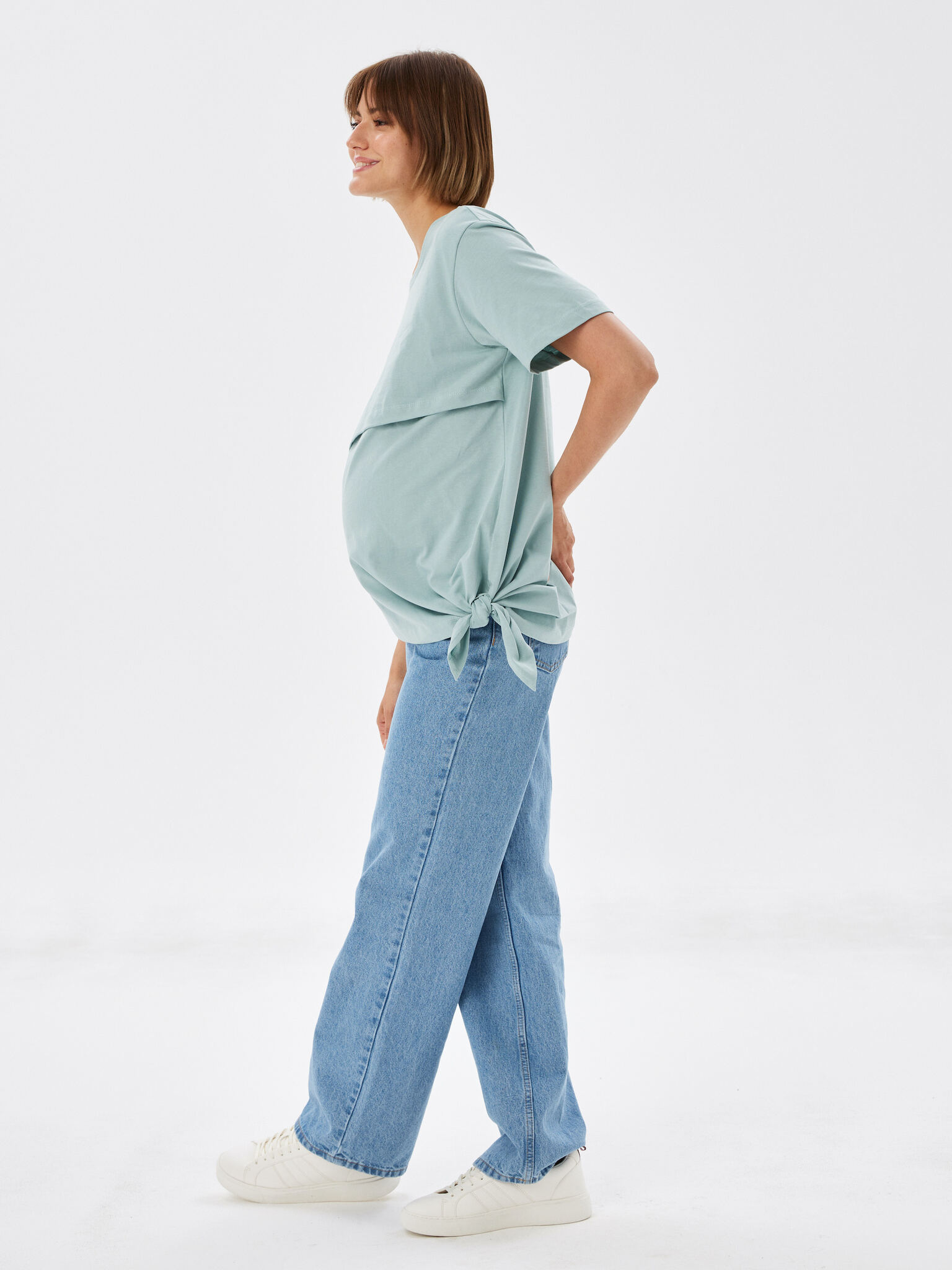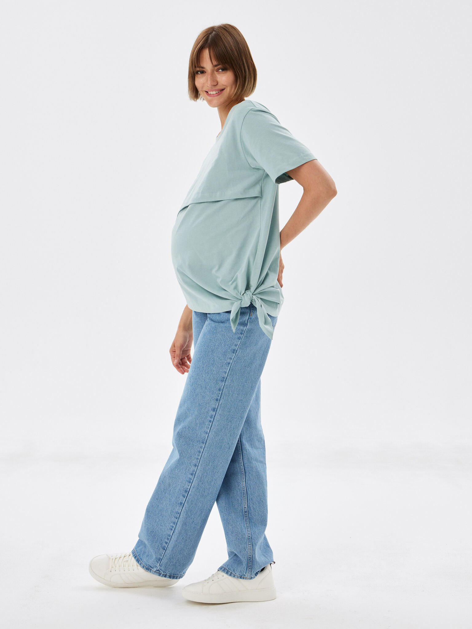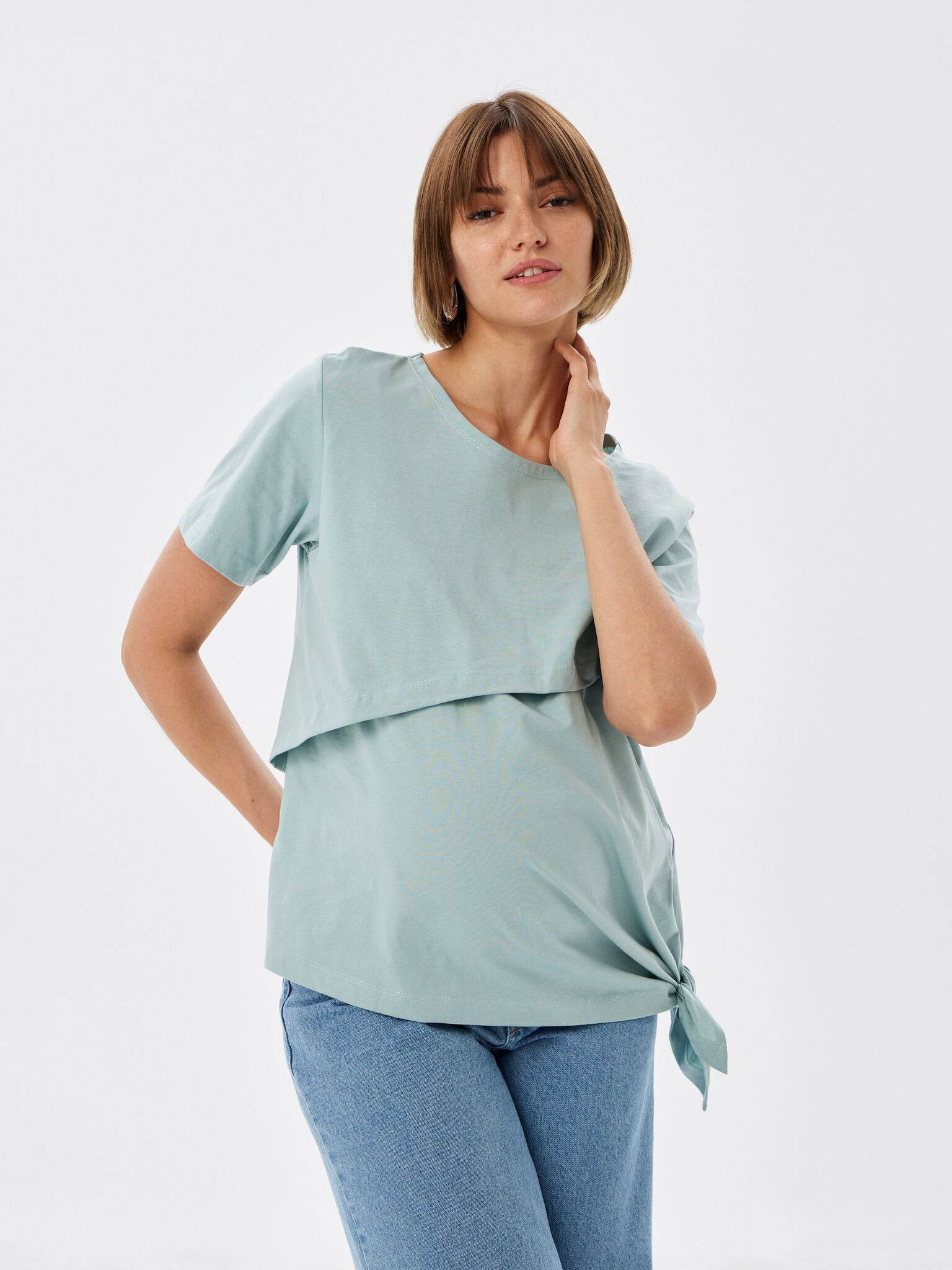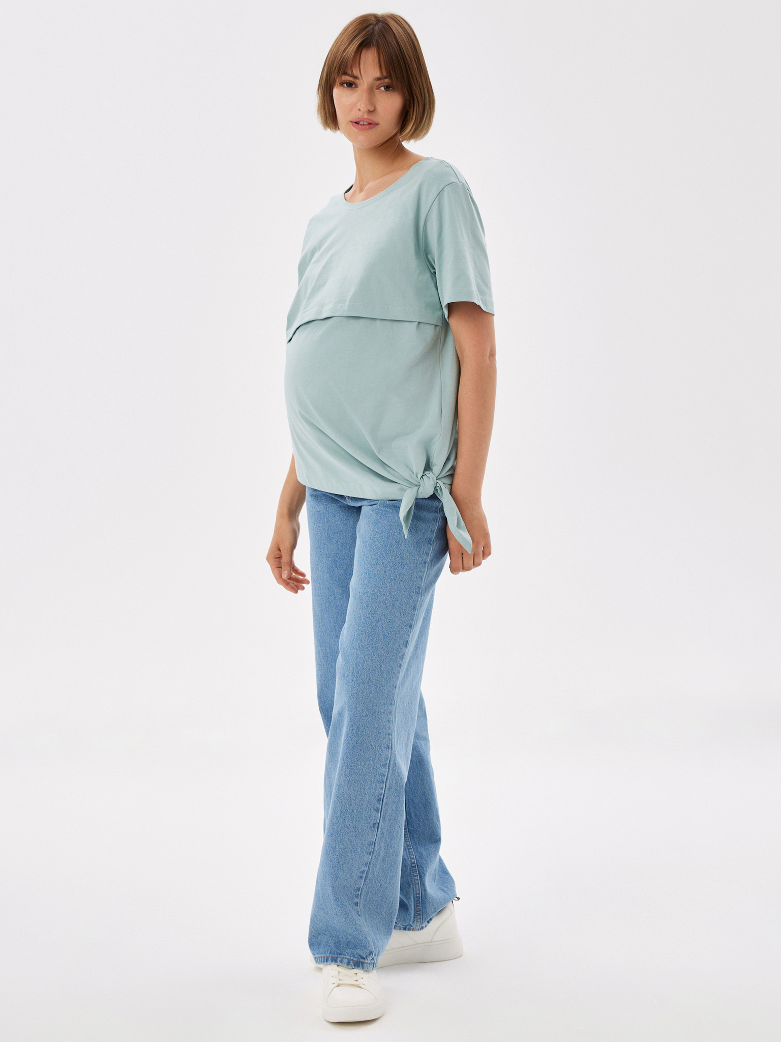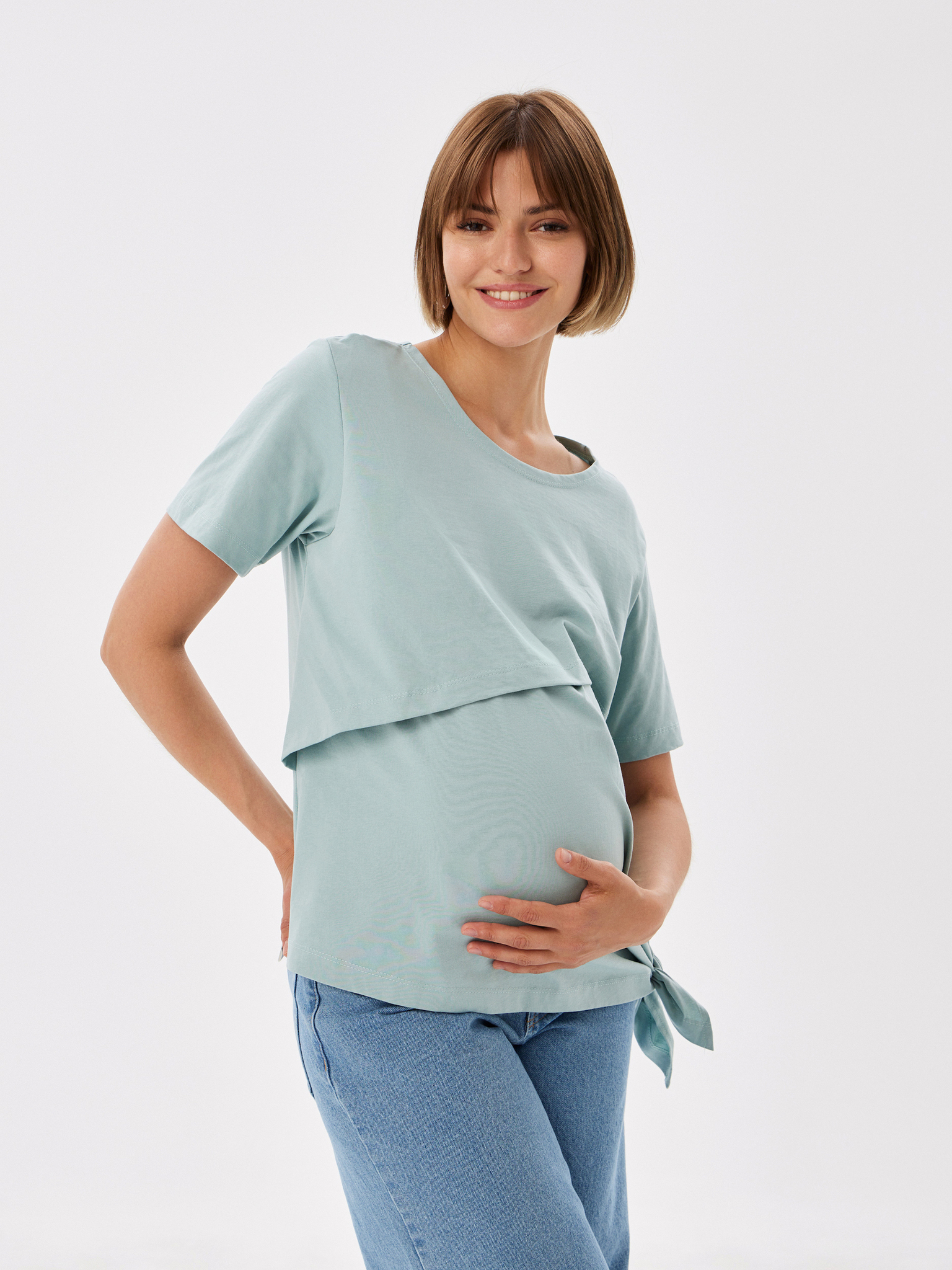 Футболка свободного кроя для кормящих мам сшита из хлопкового трикотажа. Фактура ткани - не однородная, "в мурашку". Сбоку завязывается на узелок.
